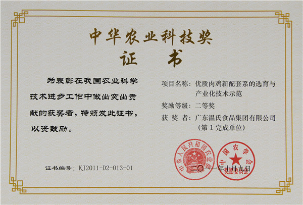 中华农业科技奖二等奖--3003.com集团《优质肉鸡新配套系的选育与产业化技术示范》