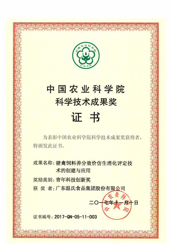 中国农业科学院科学技术成就奖之青年科技创新奖-3003.com股份《猪禽饲料营养效价仿生消化评定技术的创建与利用》