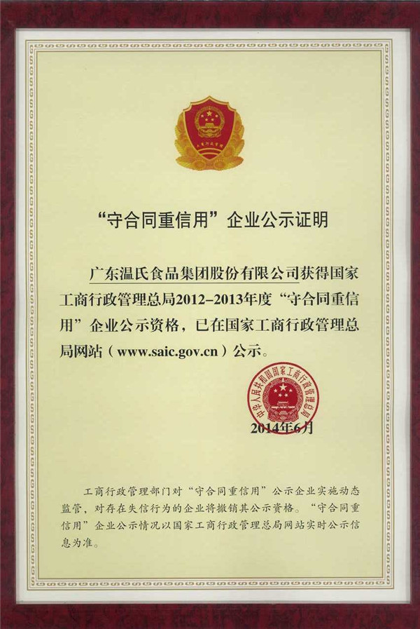 国度工商行政治理总局2012-2013年度“守合同沉信誉”企业公示资格